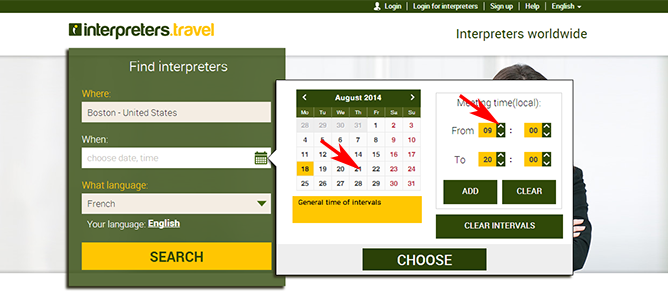 Seleccione una fecha en la que le necesita el intérprete, después seleccione el período de tiempo para ese día. Añada la fecha y hora seleccionada, haciendo clic en "Añadir". Se puede especificar la cantidad de los días o períodos de tiempo.