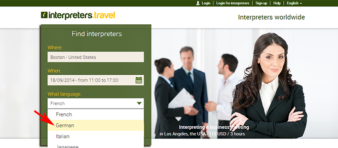 En el campo “QUE IDIOMA NECESITA” indique el idioma deseado de la interpretación de la lista, que los intérpretes proporcioan en la ciudad seleccionada.